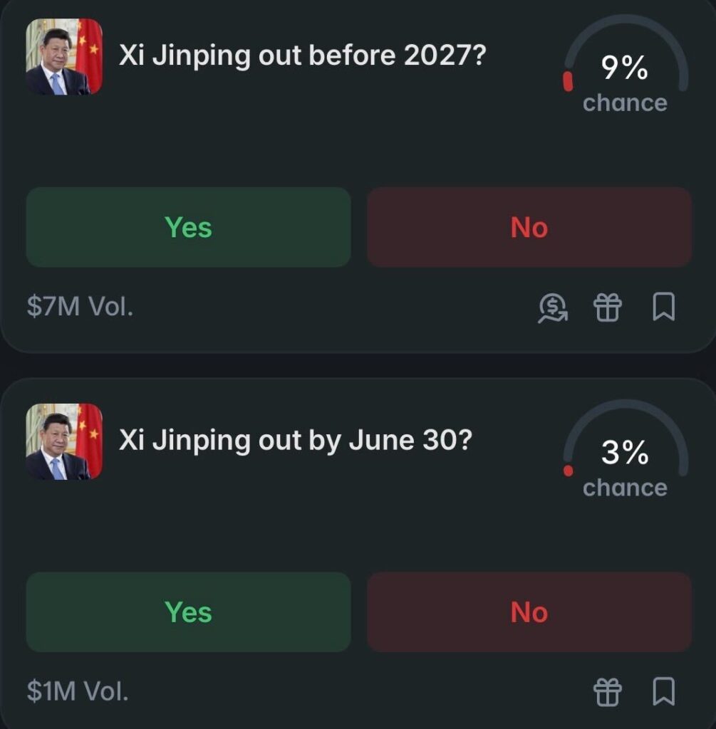 For Xi Jinping the platform hosts markets including “China coup attempt before 2027?” and “Xi Jinping out before 2027?”