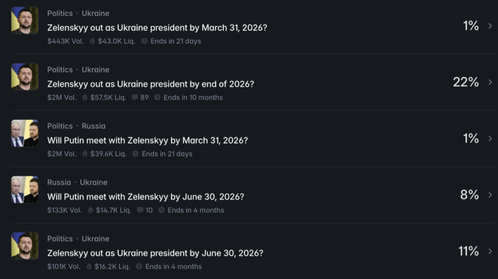 For Putin, a market is available that asks “Putin out as president of Russia by 2026?” and even more markets are available that ask similar questions about Zelenskyy.