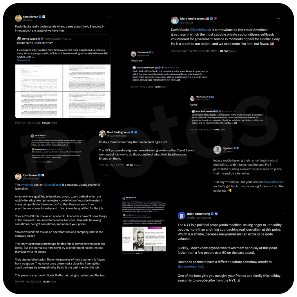 Marc Andreessen, the founder of a16z, called Sacks “a credit to our nation,” Don Wilson of DRW declared he was cancelling his subscription to the NYT, Brian Armstrong, CEO of Coinbase, stated the NYT is “a political propaganda machine,” and Shaun Maguire, partner at Sequoia, characterized the article as “an attempted hit piece.”