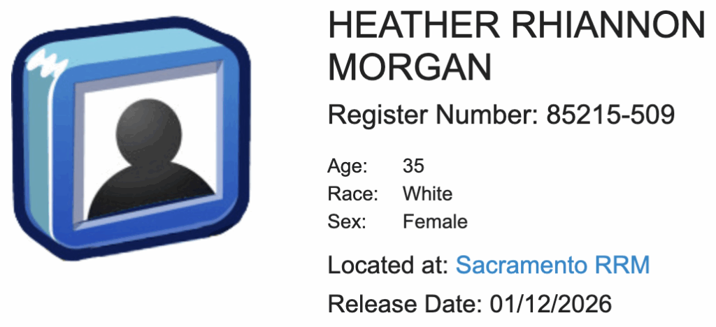 It states that Morgan is under the care of the Sacramento Residential Reentry Management (RRM) field office, and that her release date is still January 12, 2026.
