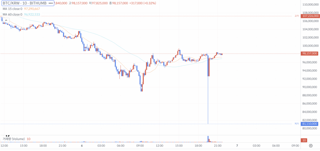 Earlier today, X users noted that Bithumb’s listed BTC/South Korean Won (KRW) trading pair plummeted by 10% in the space of a minute before returning to its original price.