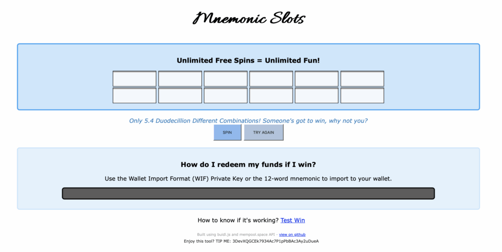 The January blues got you looking for an easy win? Fancy gambling on bitcoin (BTC) risk-free? GitHub user Coinables’ webpage Mnemonic Slots lets you spin a seed-phrase slot machine, and checks if the resulting address holds any BTC. “Unlimited Free Spins = Unlimited Fun!,” the site claims.
