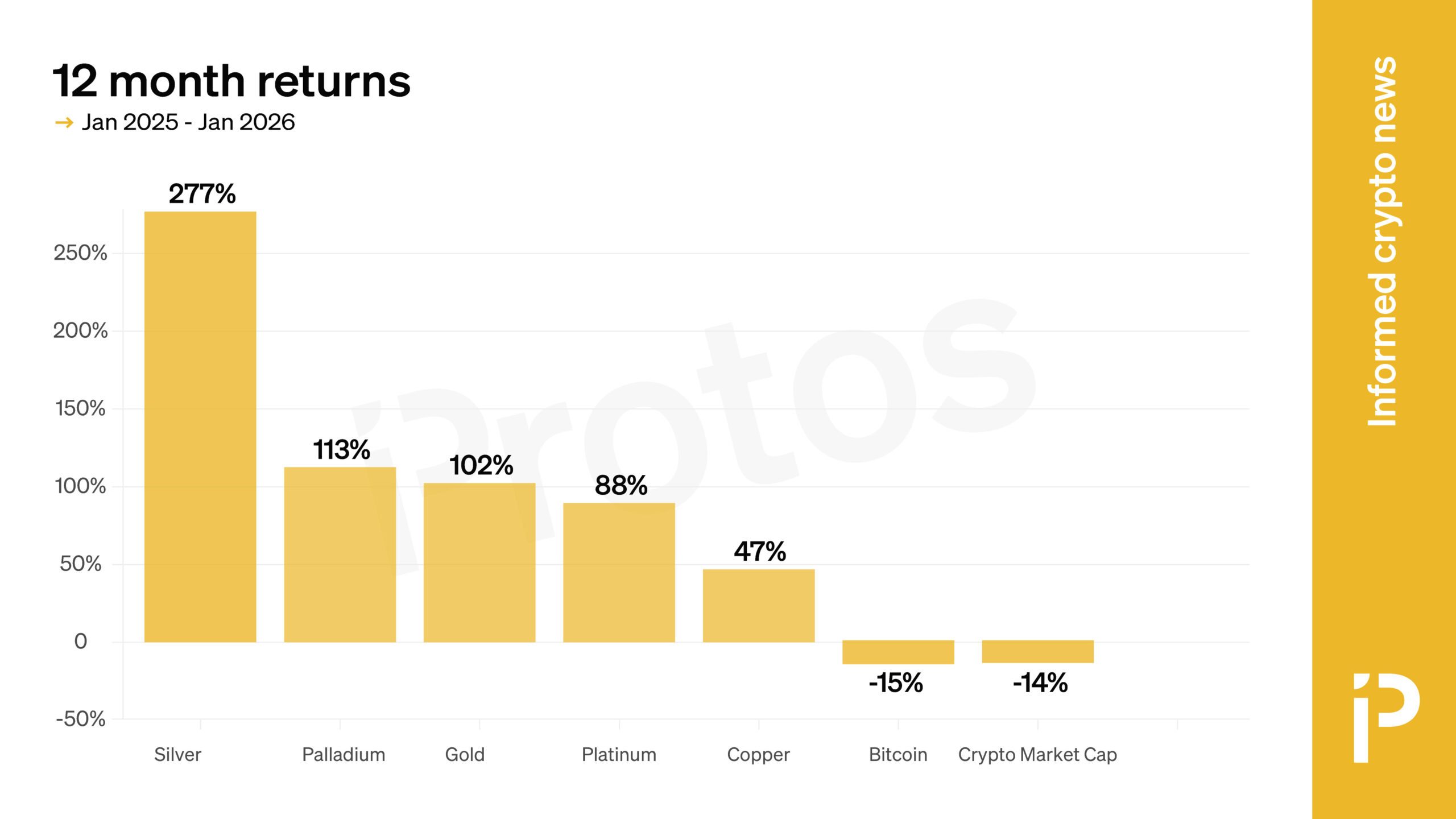 Silver — which was smaller than BTC as recently as spring 2025 — has rallied 277% in the past 12 months and is now quadruple the size of BTC.