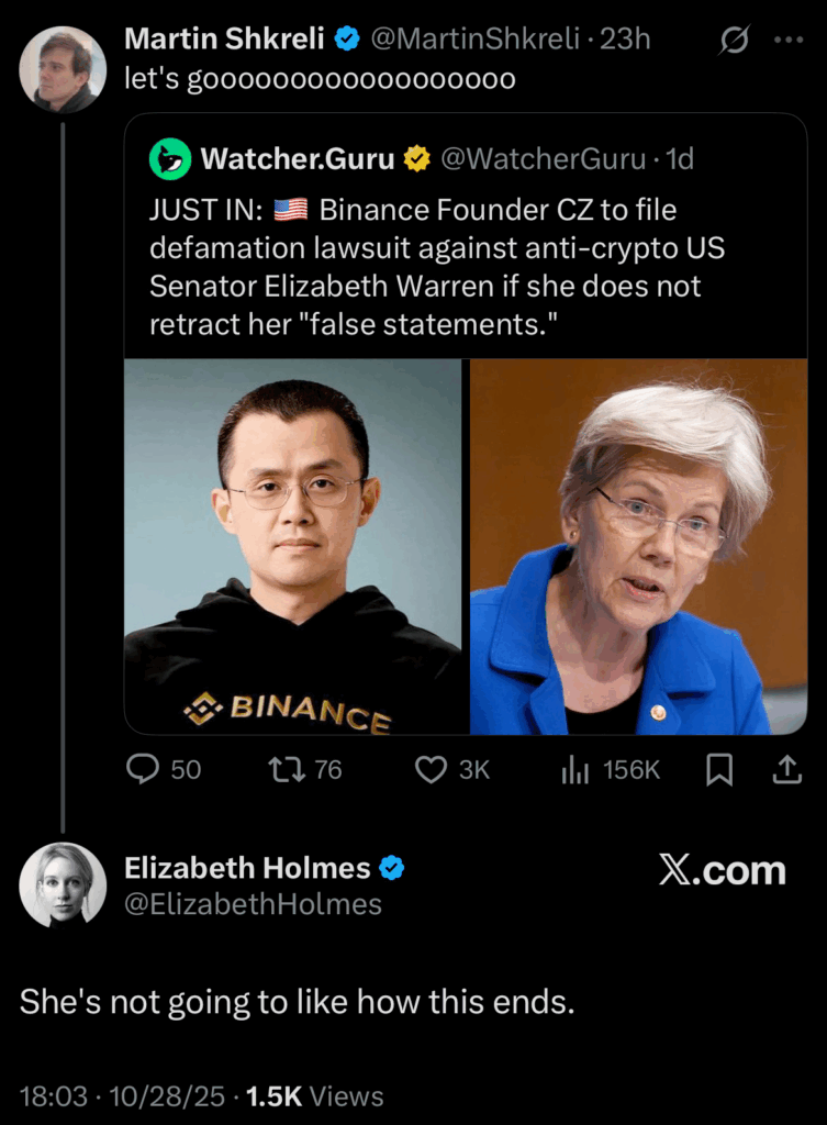 CZ threatens Elizabeth Warren with lawsuit over ‘money launderer’ claim