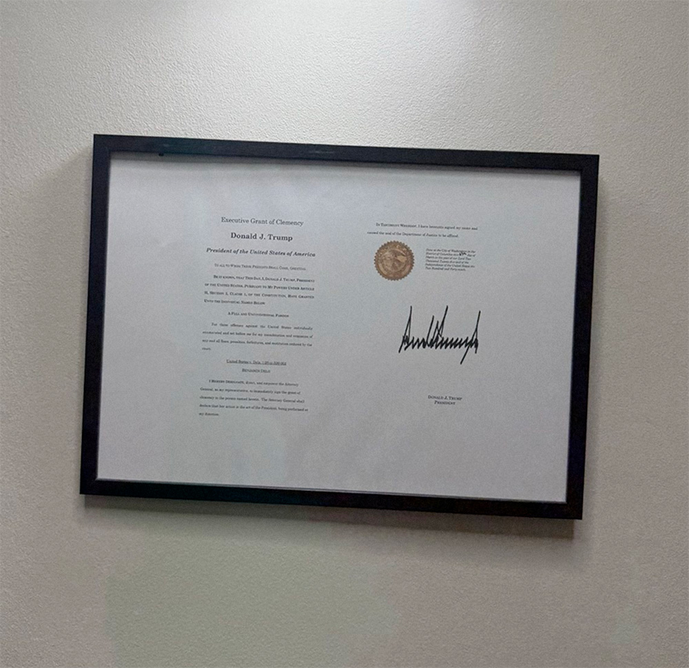In one framed picture of Delo, there’s a letter from Claire Fox, who runs The Battle of Ideas, praising Delo as “our free speech hero.” A copy of Delo’s pardon from Donald Trump is also framed in the halls.